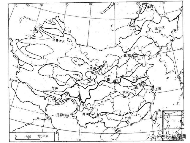 一月份是北半球最冷的月份,0℃是水的结冰点。最冷月的平均气温是在零度以上还是以下显然可以作为一个气候温暖或寒冷的界限,也就是南北方的界限。如上图示,零度等温线也大致在秦岭淮河一线,比淮河也要靠北一些。