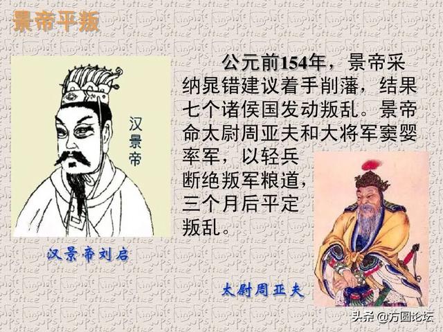 经历了汉惠帝、文帝时期的发展,各个诸侯的势力已经很庞大了。严重威胁到中央集权和国家统一,所以大臣晁错提出了削蕃的建议,但却由此激化了中央和地方的矛盾,引起了我们知道的“七国之乱”,最后汉景帝没办法,只好杀掉晁错求平安,可惜他不知道杀晁错只是借口,夺大权才是真的,还好最后出了个周亚夫,一举平定了诸侯之乱。