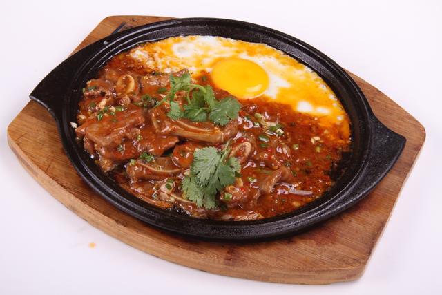锅中留油,中火烧至120℃,放泡椒末30g、姜末5g、蒜末10g炒香,至油变红,加青红椒粒、鲜汤、精盐2g、味精1g、白糖15g、料酒2g、醋15g、生抽3g、胡椒酱15g调味,放入牛仔骨略熟软,勾芡收汁亮油放入葱花15g、香油1g,装入烧烫的铁板中。
