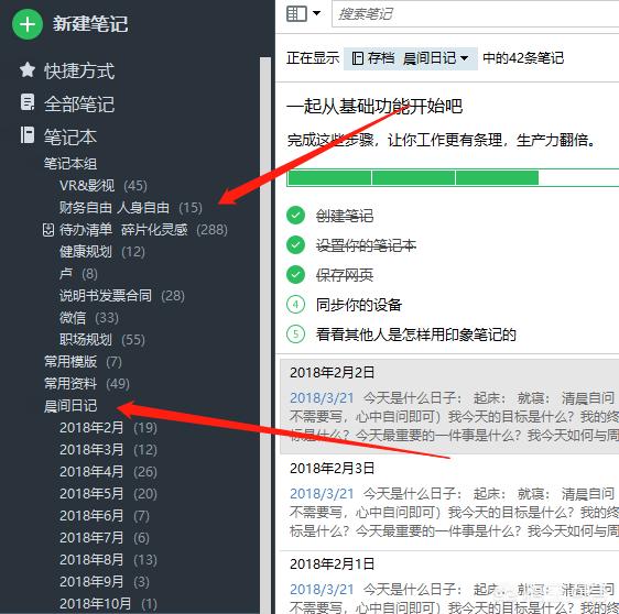 五、把目标落地到晨间笔记并使之成为模板,推荐使用印象笔记APP新建一个晨间日记文件夹存放每天的日记,这样你每天都可以检视自己有没完成当日的目标。