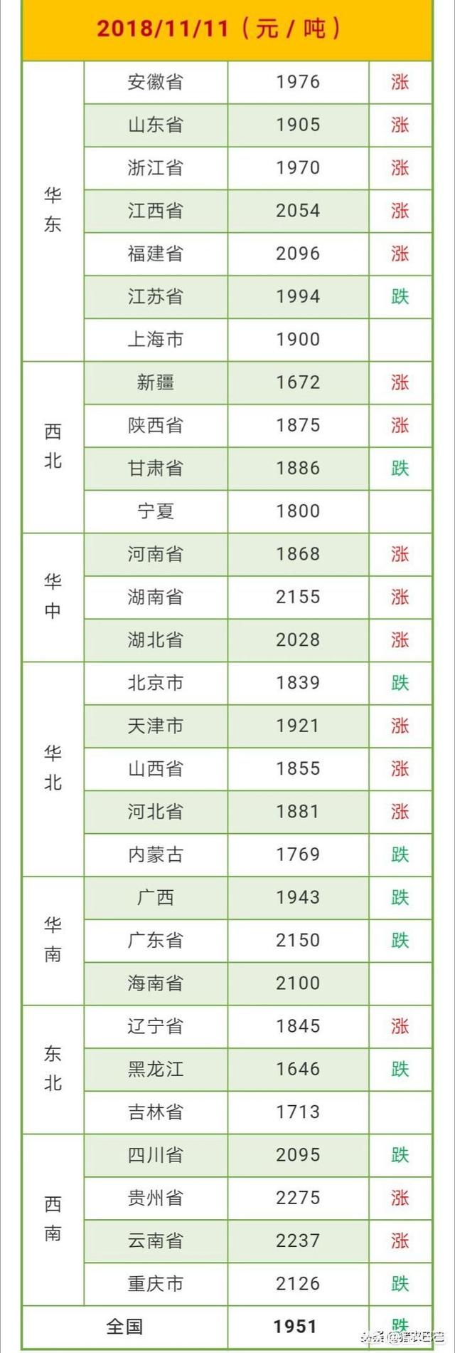 二、从现在的市场玉米行情来看,东北、华北等地近日上涨明显。截至11月11日,全国玉米均价1951元/吨,华中、华东、华北等部分省份上涨,最低价仍是黑龙江,1646元/吨。请看山东地区价格偏高,有英轩、西王等多家玉米加工企业收购价稳定在1元以上。东北地区、也是黑龙江、吉林虽有上涨,但价格也仅在0.83-0.85元/斤左右,但农民在家卖粮价格还要低一些,大约在0.72到0.78元/斤,价格距离大家心目中的价位每斤一块钱还有很大距离。是11月11日,各地玉米价格供大家对比参考: