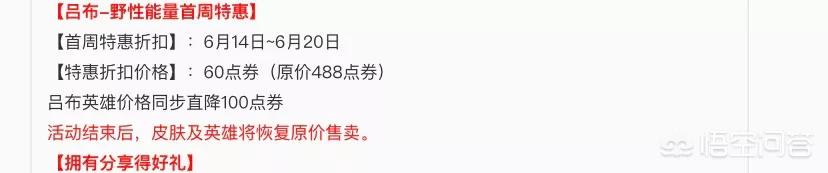 - 答案是:no!吕布新皮肤将在6月14日上线。首周折扣,六元,与其他六元皮肤一样,再次返场时需要488元。不得不再说一遍,天美真是营销鬼才。同时英雄吕布同步降价,100点卷。活动结束恢复原价。并且分享有礼。