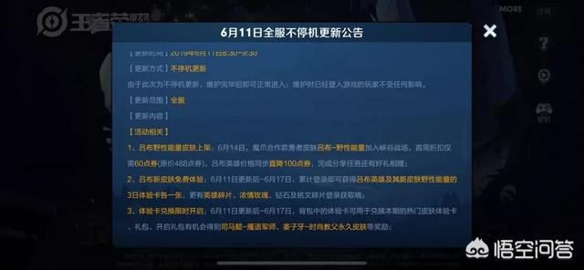 - 与以往不同的是,这次的吕布新皮肤可以提前体验。更新后,玩家在6月11日到6月17日登陆即可领取一张吕布新皮肤三日体验卡。还有其他很多礼品,大家看图!这里就不多说了!