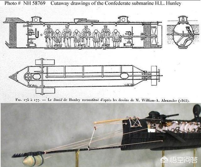 复原的德雷尔潜艇,但其基本原理跟现代潜艇相似,德雷尔也被称为“潜艇之父”。而潜艇的第一次投入实战则是要到1864年,美国南北战争时期南军上尉乔治·迪克森率领“汉利”号,对北军“豪萨通尼克”号军舰发动了袭击,并顺利将敌船炸沉,但撤退的时候“汉利”号不幸沉没了,全艇无人生还。
