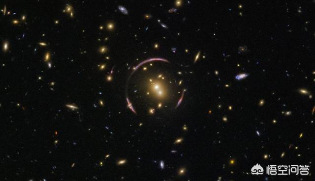 遥远的星系因为有庞大的质量,产生的引力能够让背后的一些星系图像弯成环形,这些环就被称为爱因斯坦环。
