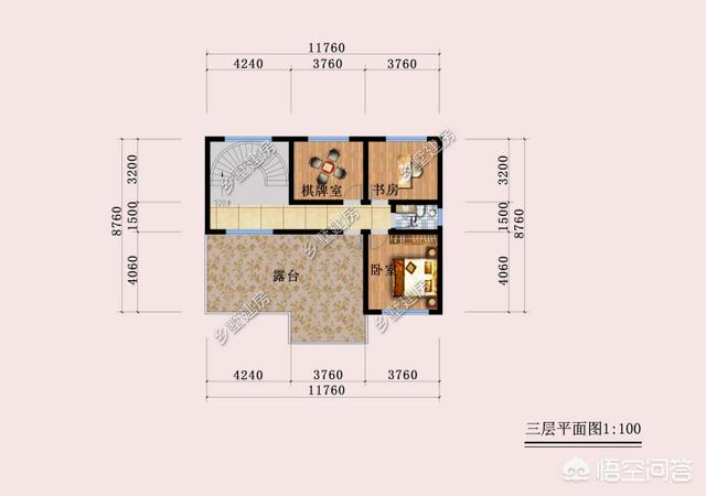 三层设有:棋牌室,书房,卧室,露台,卫生间