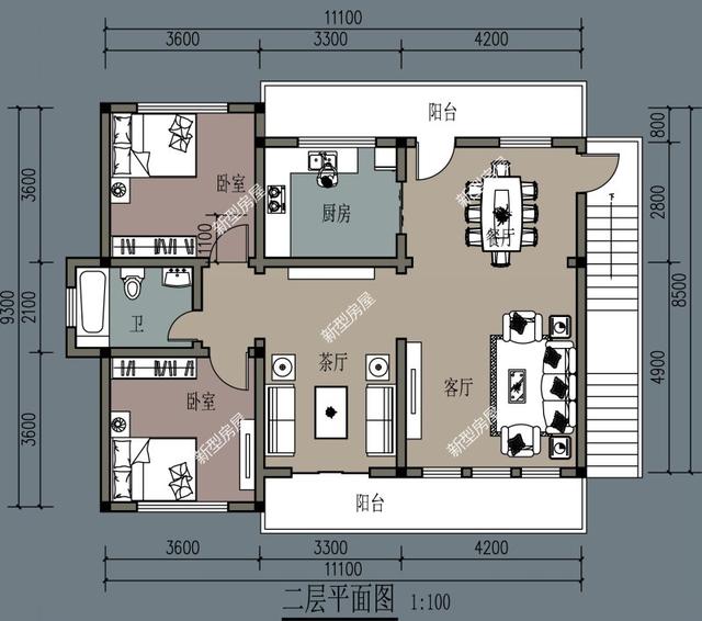 第3套:落地窗+双阳台,9×11米二层平顶雅宅,主体预算25万