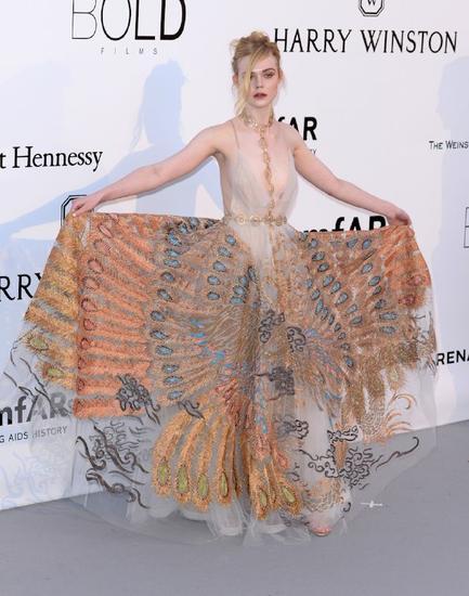 最后我们看看这个,小姑娘也是拼了,掉进了“禽类” 圈里而出不来。这是艾丽-范宁在戛纳某次活动上的造型,如孔雀开屏一样的造型,你以为你是杨丽萍。就算是的话,麻烦把头发梳理一下,俗话说:早起的鸟儿才有虫吃。