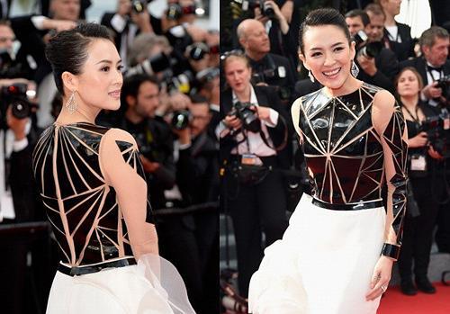 章子怡穿着的是Stéphane Rolland未来感礼服,这件礼服简直就是“矛盾集合体”哇!黑色亮面皮革与激光切割的几何形状,看起来有种“剽悍”且摇滚的气场呢~~但矛盾就在下半身金鱼似的裙摆既浪漫又女人,还别说,这一软一硬的矛盾组合还真是有不同感觉呢!