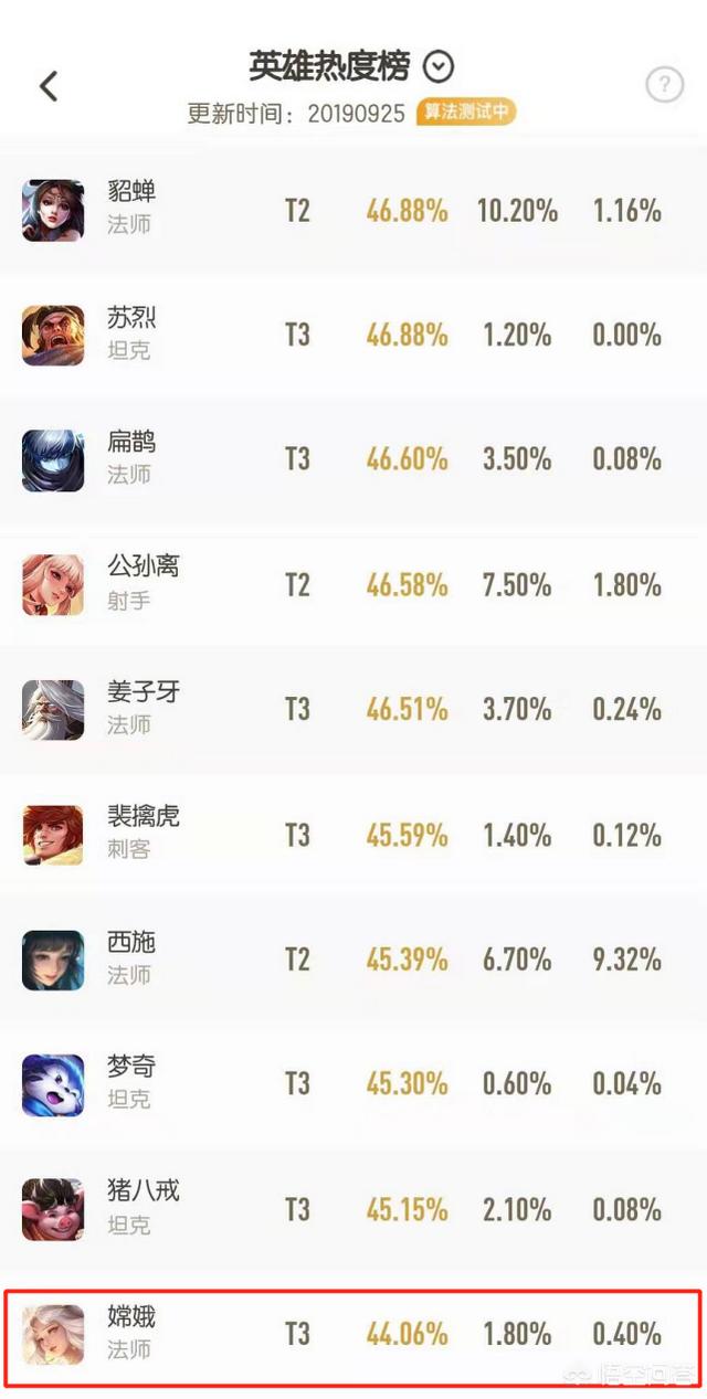 路人局嫦娥胜率倒数第一(仅44%)已经有挺长一段时间了,漫雨个人是觉得嫦娥是应该加强了,不然出圣杯蓝量都能打空,这游戏体验感也太差了。不过嫦娥这英雄也算是比较典型的高端局、KPL英雄,要因为中低端局表现太差而加钱,估计可能性并不是特别大!