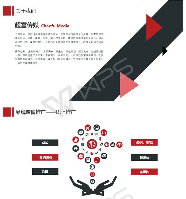 公司宗旨:以打造品牌增值服务为宗旨,以国际化传媒理念为先导,注重客户品牌的时尚、品味、精美和创新,努力打造全新、高端的品牌增值服务平台。将以合理的价位、缜密的执行、优质的服务并输送到主流媒体推介,扩大客户的知名度。