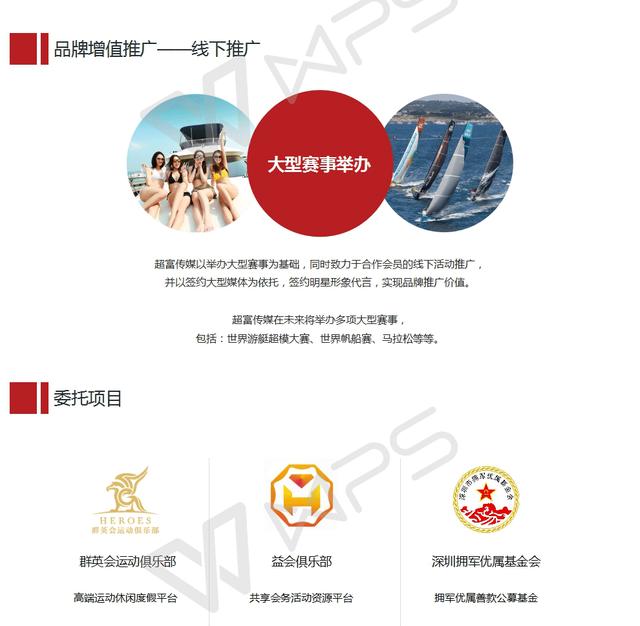 服务范围: 集品牌推广、大型赛事、基金会、增值策划、媒体发布、游艇摩托艇大赛、签约明星广告代言、影视制作、会务沙龙、大型活动及演唱会策划、礼仪庆典策划与咨询、代理影视、音乐制作和发行唱片、艺术培训及其他综合服务为一体的传媒增值服务。超富传媒以举办大型赛事为基础,同时致力于合作会员的线下活动推广,并以签约大型媒体为依托,签约明星形象代言,实现品牌推广价值。超富传媒在未来将举办多项大型赛事,包括:世界游艇超模大赛、世界帆船赛、马拉松等等。