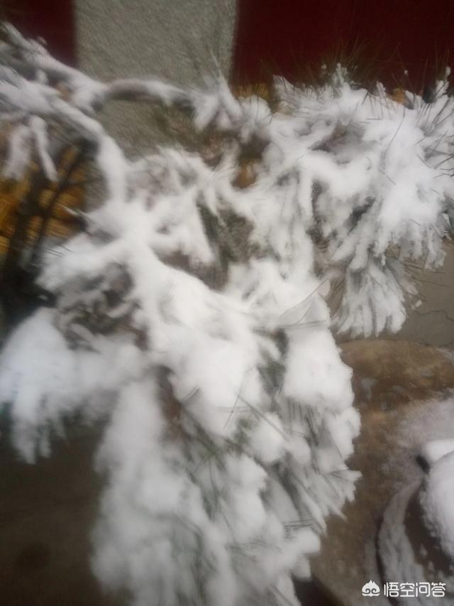 早晨扫完院中雪后,先拿手机拍一个盆景雪松图。