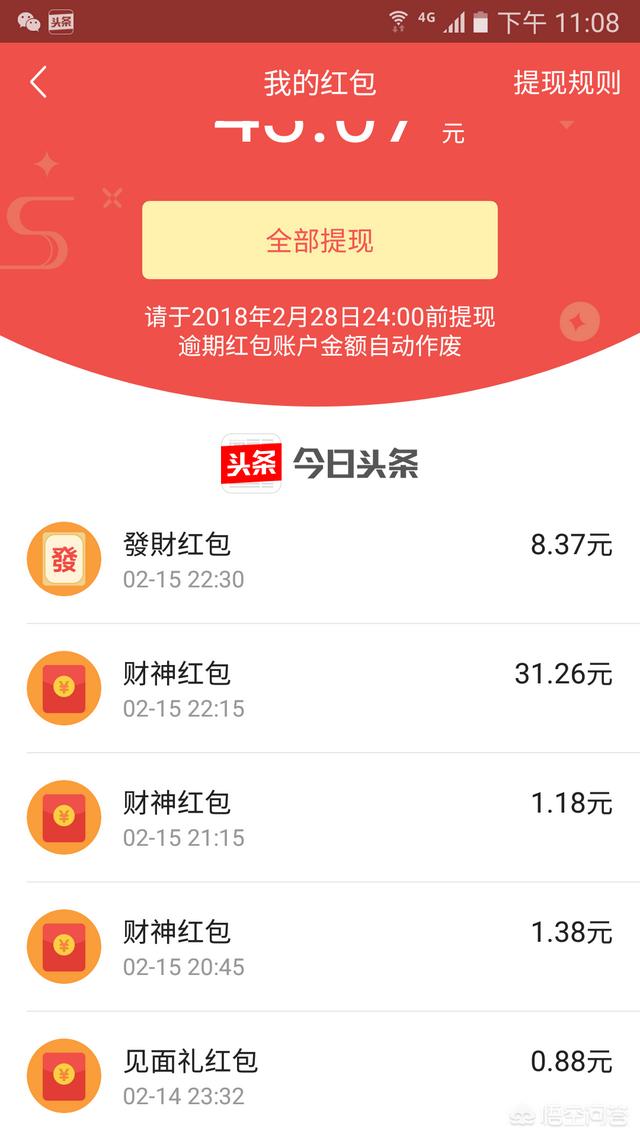 还有就是有可能有时间限制,要过多长时间红包在今日头条里呆够多久才能体现,据网友所说,是这样的,但是我的就是,我必须先把前三天抢到的红包提现才能,提后面抢到的十二生肖红包。