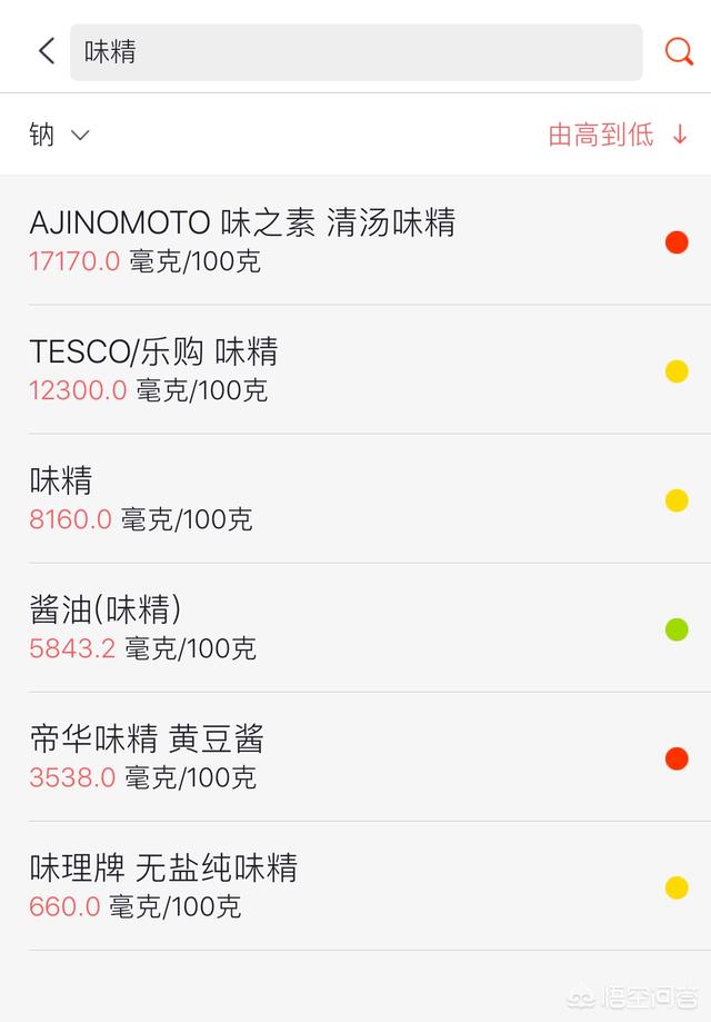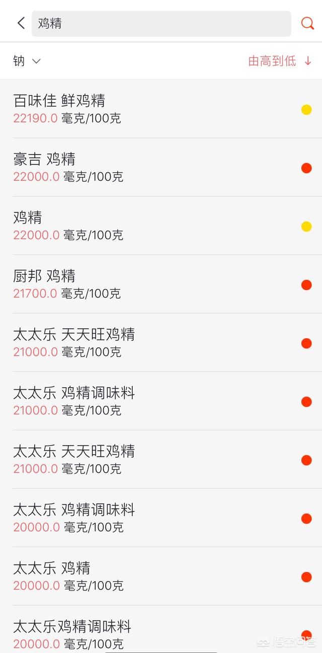 两种调味品有一个共同特点,那就是钠含量过高。其中钠含量最高的是鸡精,平均每100g中钠含量为21g;其次为味精,平均每100g中钠含量为8.2g。