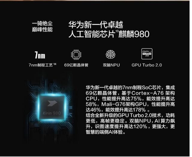 - 麒麟980 7nm a76架构,华为最新的990也是a76所以980到990进步不是很大,可以期待一下今年下半年的麒麟1020。