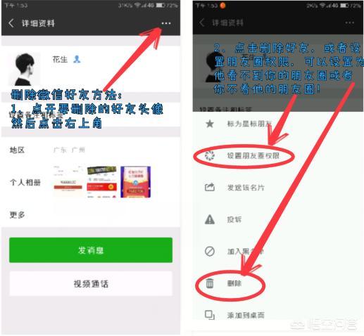 如果你要删除微信好友很简单,点击好友的头像,然后再点击右上角“三个点”的地方,在弹出来的选项点击删除好友就可以了。如果你以后都不想看见某位好友发的朋友圈,大致方法也差不多,如图: