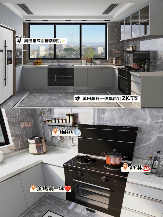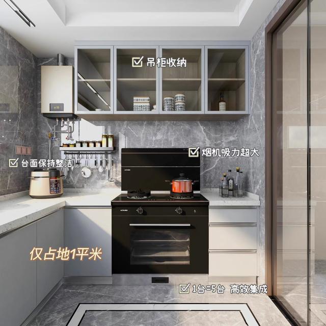 Tips2:厨电选择。对于极简厨房设计解决油烟和厨房收纳问题是关键,而一台奥田集成灶就能解决。20m³/min的油烟吸净率,效果比传统烟机要好很多。另外它集烟机、灶具、蒸箱、烤箱、消毒柜于一台,仅占地1平米,提高厨房空间利用率,能给寸土寸金的厨房多出近一米的收纳和一个吊柜的空间,不香吗?