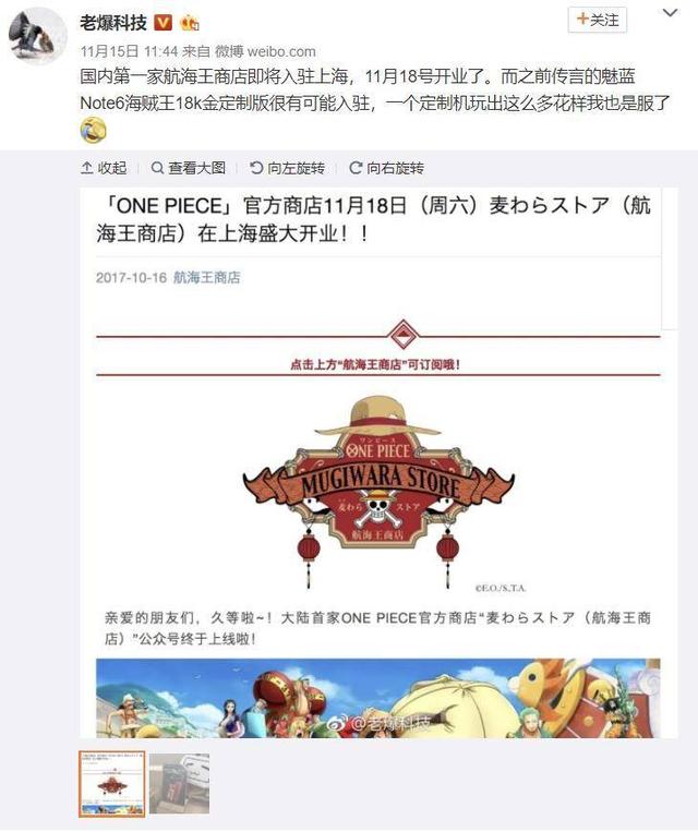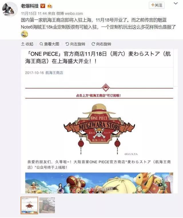 - 国内第一家航海王商店即将入住上海,11月18号开业,而魅蓝Note6 18K金就作为珍藏版入驻。