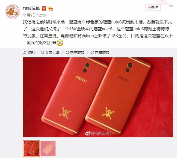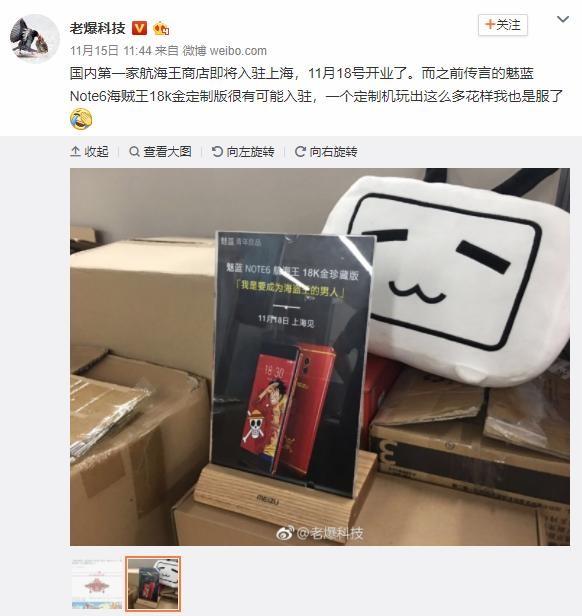 根据知名数码博主@老爆科技在11月15日所发布的微博信息来看,之所以会有魅蓝Note 6航海王18K金定制版的消息传出,是因为国内的第一家航海王商店将会入驻上海。而魅蓝Note 6航海王定制版在设计的时候就得到了航海王官方的认证,因此我们也可以将这款定制机视作为航海王漫画的官方周边。为了庆祝国内首家航海王商店的入驻,魅蓝专门打造一款魅蓝Note 6航海王18K金定制版并没有什么不可能。