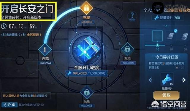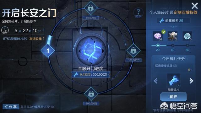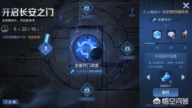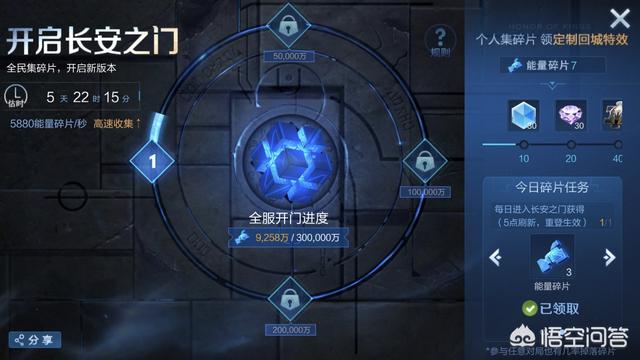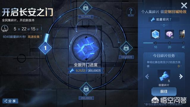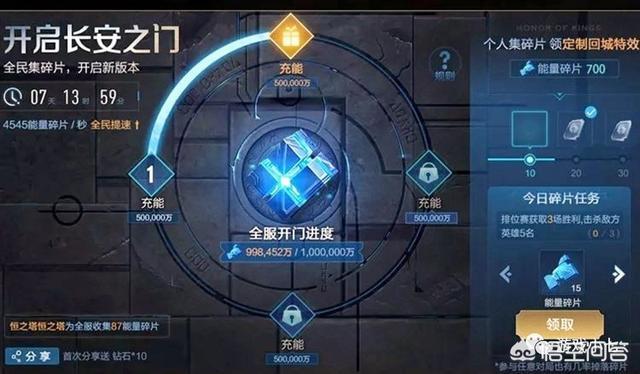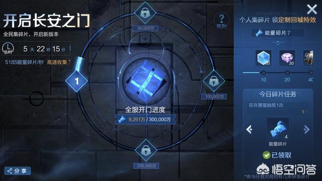 这次长安之门活动的规则就是全服获得能量碎片,可以通过5v5、排位、大乱斗等模式完成任务获得能量,能量达到不同级别领取不同的奖励。