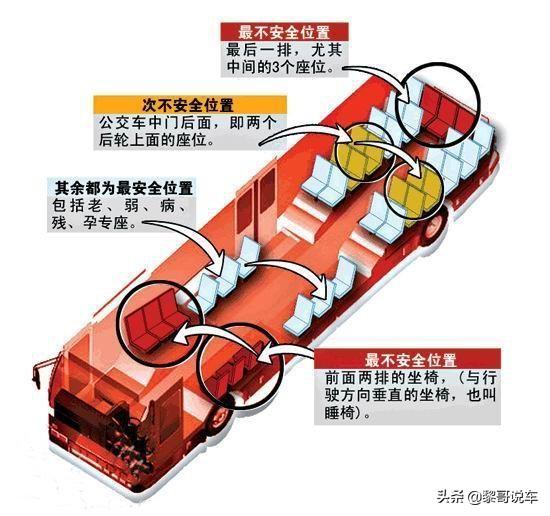 1.最不安全座位,也就是图中的红色座位。前面两排的红色座椅下面就是行驶的轮胎,一旦发生爆炸,就会殃及坐在上面的乘客。而且这个位置离司机的位置最近,一旦发生急刹,就很容易惯性扑倒前方。最后一排的红色座椅,如果公交车发生追尾,座位上的乘客最容易受伤,尤其是脖子。