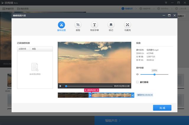 这个软件我现在也在使用,支持读取、剪辑、合成、转场、特效、字幕、配音、录音等功能。还可以在视频中叠加各种素材效果,如相框、动画、图画等。简单的剪辑这个够用了,没有什么弹窗广告。