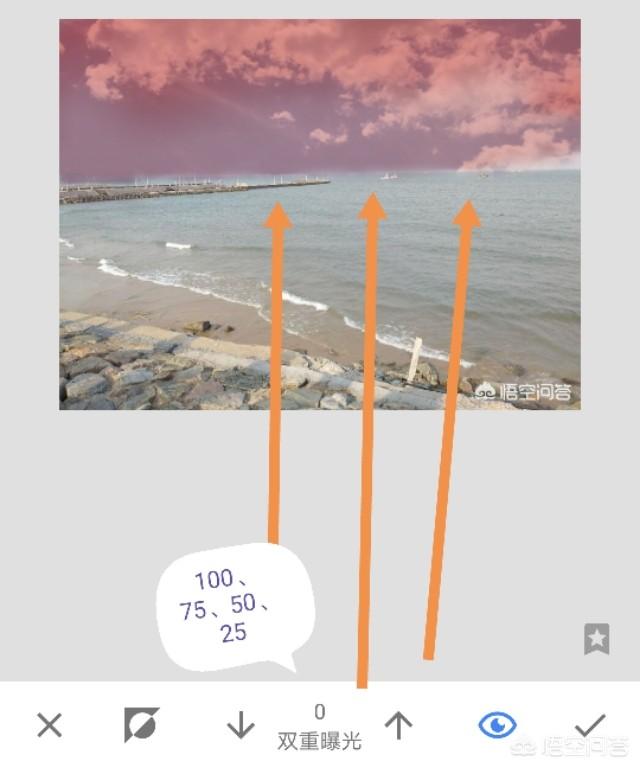 4、新的页面,在图片下方的“双重曝光”,数值可设置为100、75、50和25,对天空进行涂抹。【技巧】,随时点击右下角的眼睛,查看哪里深蓝,哪里潜力,觉得应该浅,反而深了的地方,就用数值小的涂。感觉应该深,反而浅了地方,就用深的涂。