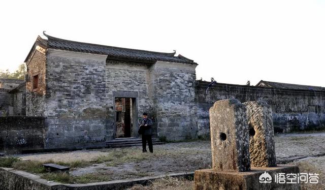 利用古围屋前的古旗杆石作前景