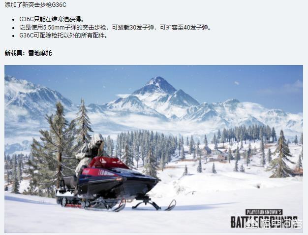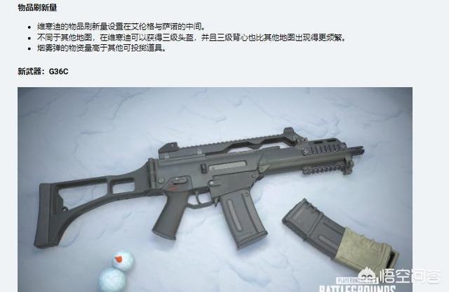 3、新枪械:G36突击步枪(新地图专用武器,只能在维寒迪(vikendi)地图获得,作为一款雪地的突击步枪,移动射击优秀,使用5.56毫米自动,不扩容30发子弹,扩容可增加到40发子弹,射速中等,单发伤害较高。)