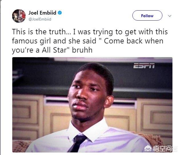 恩比德去年其实也有机会进全明星,但是投票方式改革了,以前是球迷投票决定先发,去年加上了球员投票和媒体投票,恩比德遗憾落选。如果只看球迷投票,他是可以入选的。但是进全明星可以约会蕾哈娜这个梗继续留了下来。