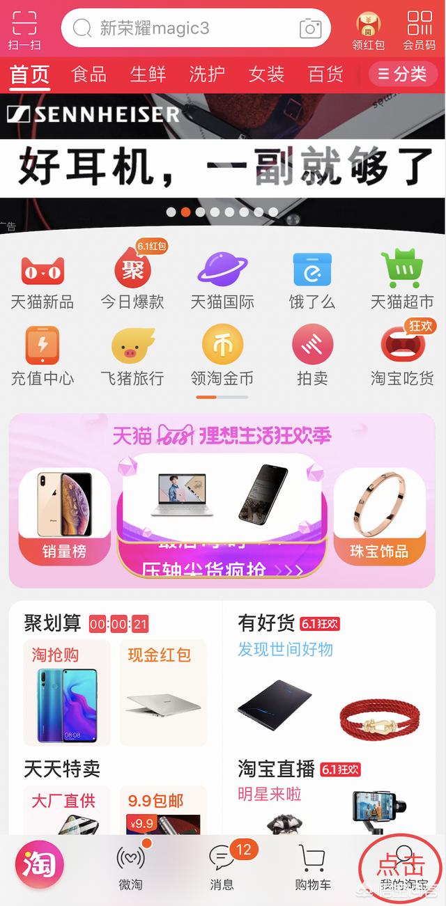 1.打开手机淘宝软件,点击右下角的“我的淘宝”,进入我的淘宝界面。