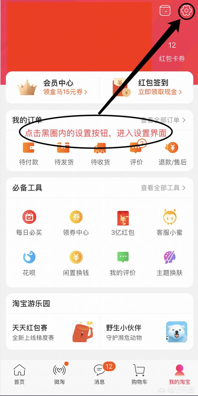 2.进入“我的淘宝”界面,点击右上角的“设置按钮”,进入设置界面。