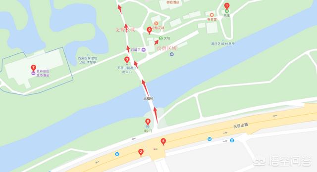 从天目山路高庄公交站下车,沿着元福桥往里走,这时候你会看到硕大的西溪湿地国家公园石碑,右边通往高庄旅游收费区域,左边直走就到了免费区域的福堤起点。从图中的箭头方向你应该就可以开单到具体的方向了,一点也不难找。