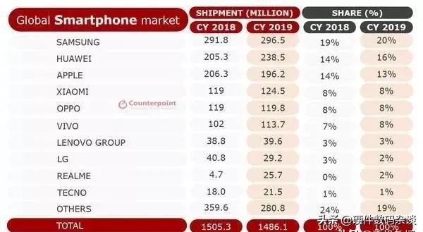 我们看一下2018年和2019年全球手机销量情况:
