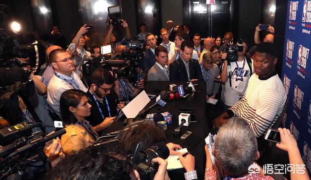 题主说的应该是这个场景吧,在2019年选秀大会前一天的媒体见面会上,准状元锡安成为媒体宠儿,十几家媒体蜂拥而至,将热门状元团团围住,面对各种长枪短炮,灯光闪烁,锡安好不自在。