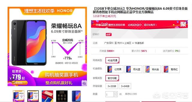 荣耀畅玩8A售价799元,京东618活动下单立减20,成交价779。