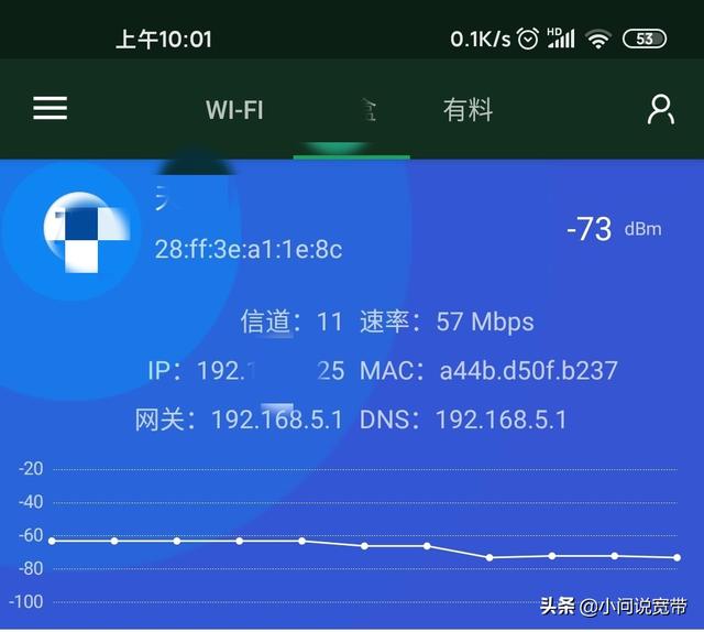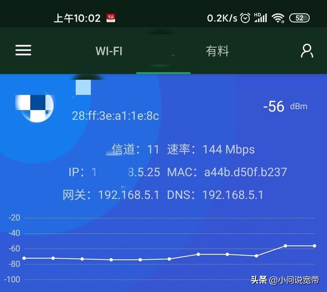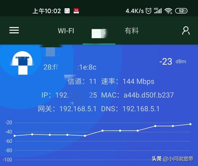 到底怎么一个强弱呢?到底又是怎样一些连接速度呢?我们可以用特有的软件进行查看,这个软件里面可以清楚的看到你当前的一个信号强度,连接速度,还能看到信道。小哥为大家展示的是一个双频路由器,我们可以看到2.4G频段 信号满格,信道为11,通过软件显示强度为-23dbm连接速度为 144Mbps。强度为-56dbm连接速度同样为144Mbps。信号为三格强度为-73dbm连接速度只有57Mbps。