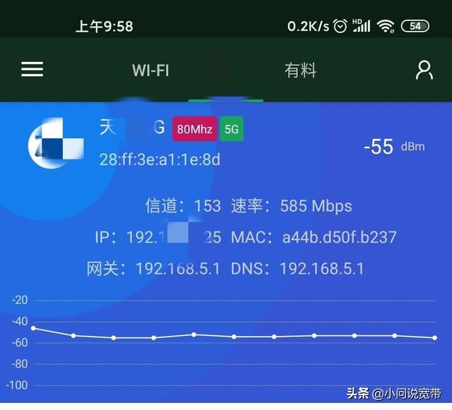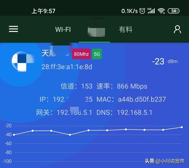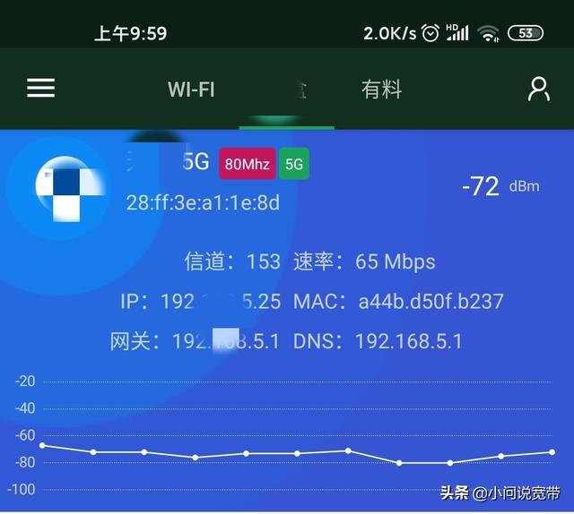 然后我们再对比5G频段 信号满格,信道为153.通过软件显示强度为-23dbm连接速度为866Mbps。强度为-55dbm连接速度为565Mbps。当信号只有两格的时候强度只有-72dbm连接速度只有65Mbps。所以信号满格和信号两格的区别还是很明显的。