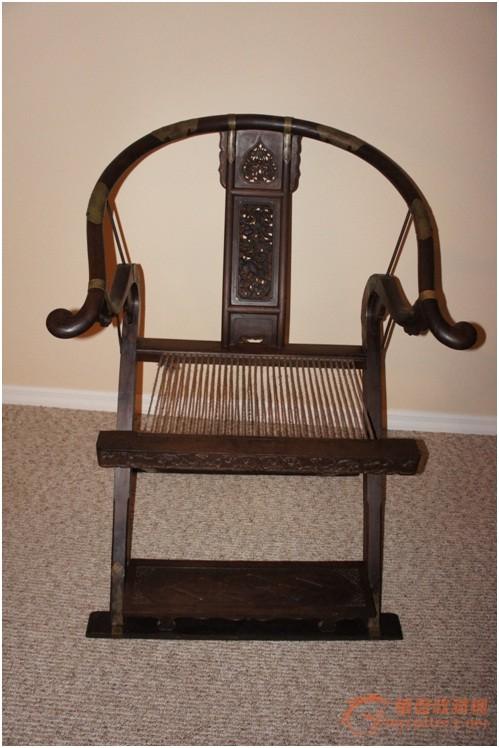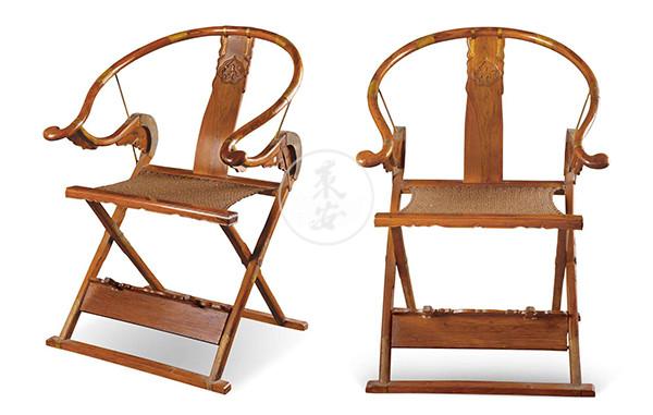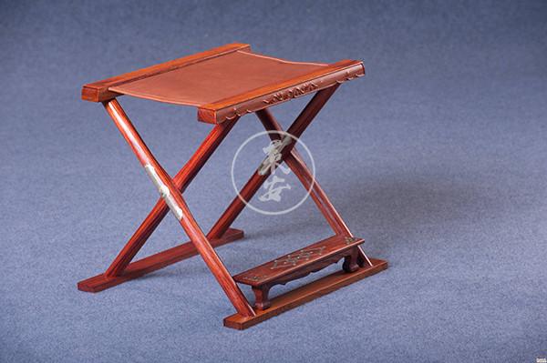 交椅 交椅即汉末北方传入的胡床,形制为前后两腿交叉,交接点作轴,上横梁穿绳代坐。于前腿上截即坐面后角上安装弧形栲栳圈,正中有背板支撑,人坐其上可以后靠。在室内陈设中等级较高。交椅不仅陈设室内,外出时亦可携带。宋、元、明乃至清代,皇室官员和富户人家外出巡游、狩猎都携带交椅。明《宣宗行乐图》中就绘有这种交椅挂在马背上,以备临时休息之用。由于交椅适合人体休息需要,故而历经千余年,形式结构一直没有明显变化。
