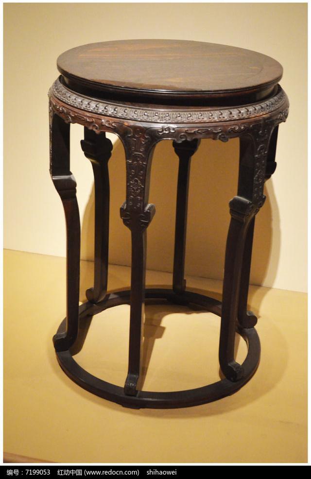 明代圆凳造型略显敦实,三足、四足、五足、六足均有。做法一般与方凳相似,以带束腰的占多数。无束腰圆凳都采用在腿的顶端作榫,直接承托坐面。它和方凳的不同之处在于方凳因受角的限制,面下都用四腿,而圆凳不受角的限制,最少三足,最多可达八足。一般形体较大,腿足作成弧形,牙板随腿足彭出,足端削出马蹄,名曰鼓腿彭牙。下带圆环形托泥,使其坚实牢固。