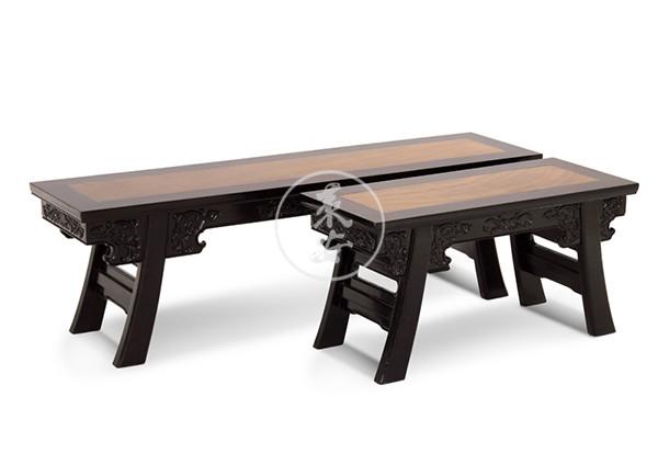 明清之际,长凳的样式相当之多。最普遍的便是小条凳,以前农村里经常可以看见。图中所示的是桌型结构的二人凳。
