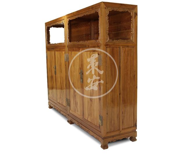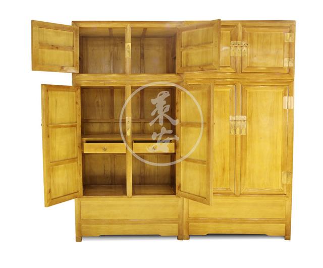 方角柜四角见方,上下大小一致。常见的方角柜有两种,上头没有顶箱的称为“一封书式”;上头有顶箱的称为“顶箱立柜”,现在多叫顶箱柜。顶箱柜比较常见,因为其按对计数,也叫四件柜。
