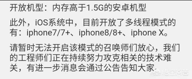 但是这个也不是全部开放,安卓是内存大于1.5G的机型,这个相信绝大多数的玩家手机都超过了吧?而苹果的也新增了好几款机型,其实在我印象中这几款机型玩王者应该都十分轻松,即使没有多线程也能稳定60fps,不过聊胜于无,总归是好一点的。