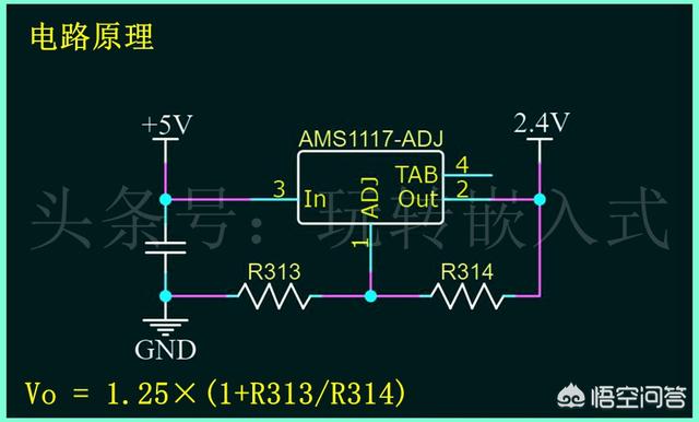 Vout=1.25*(1+R2/R1)+Iadj*R2,由于Iadj只有50ua左右,可以忽略不计,我们可以把计算公式变为:Vout=1.25*(1+R2/R1),当R1=330R,R2=303.6R,就可以得到大约2.4V的输出电压了。