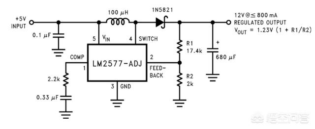 (2)若负载电流较大,AMS1117无法满足要求怎么办?可以使用输出电流较大的开关电源芯片进行降压,比如LM2596、LM2577等,下图为LM2577原理,该电路最大输出电流可达3A,其输出电压公式VOUT=1.23(1+R1/R2),将2.4V代入即可求出R1/R2的比值,选择合适的电阻即可。LM2577是很常用的电源IC,既可升压也可降压。