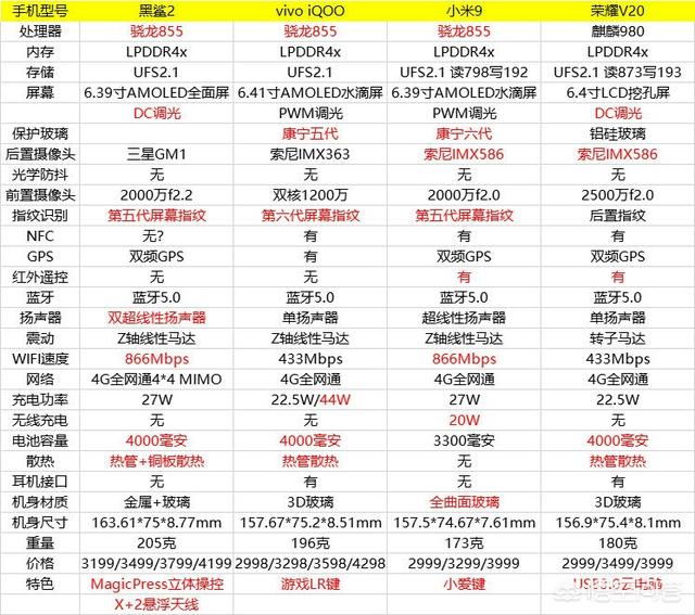 直接上图,这是几款比较热门机型,能对比好评判手机性能的了,红色的是优先选择的,比如处理器骁龙855强于麒麟980,所以玩游戏就比较顺畅,但是价格较高,那么荣耀V20依旧玩游戏没问题,比如它就带领腾讯UCL外卡赛,玩游戏都卡敢搞这个?