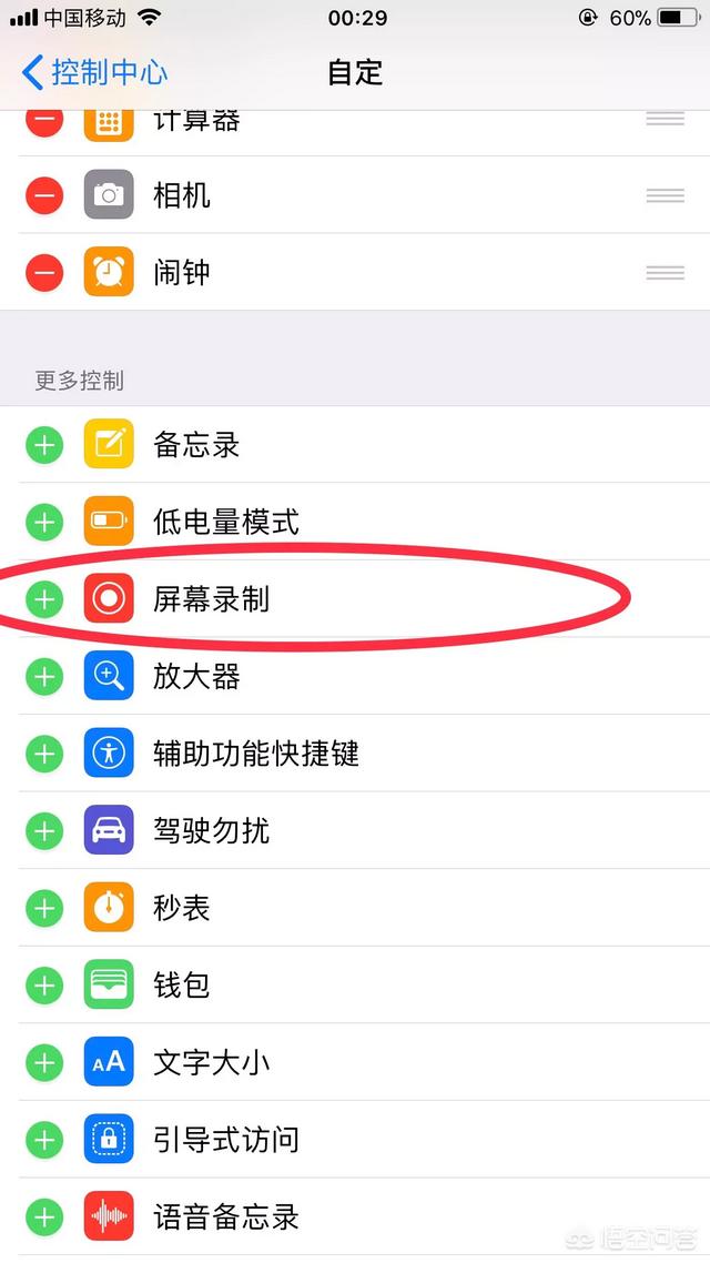 2.在控制中心里面找到屏幕录制点击左边那个➕号,