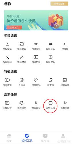 2、在视频工具页面,点击打开后期处理模块中的“视频压缩”功能,进入视频导入页面。