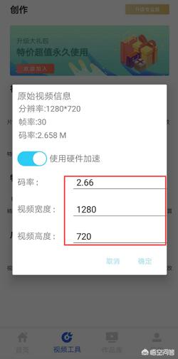 4、在视频压缩设置页面中,可以对视频的“码率”、“视频宽度”、“视频高度”进行设置,点击数字即可进行更改。